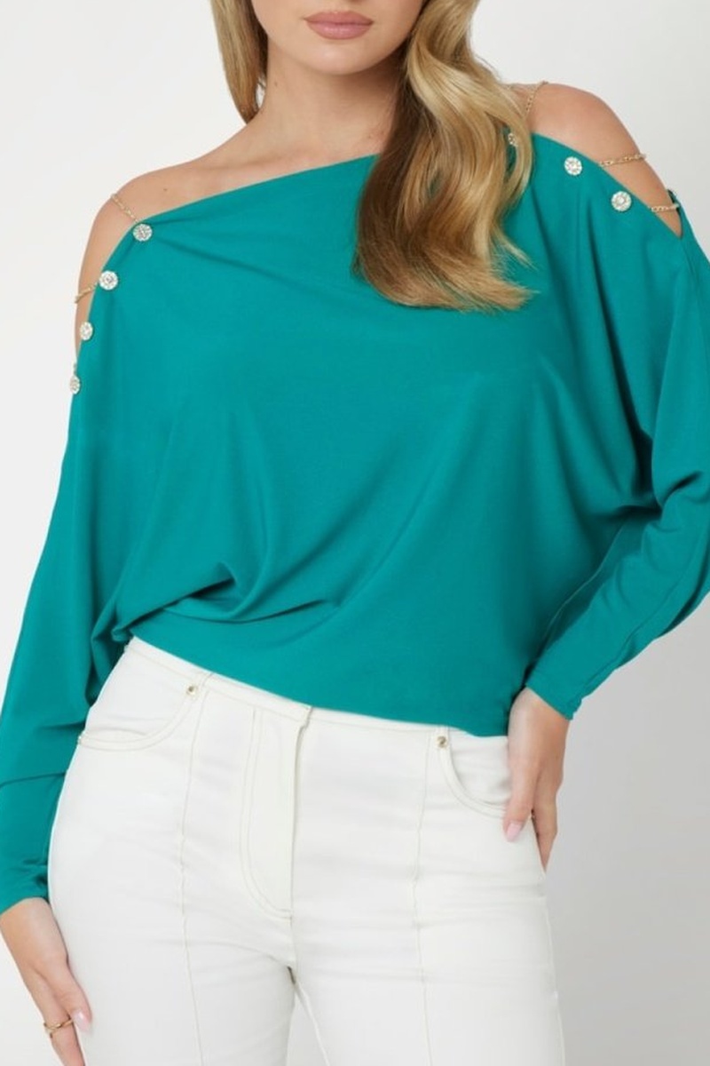 Découpe avec chaînettes et boutons décoratifs sur les manches.