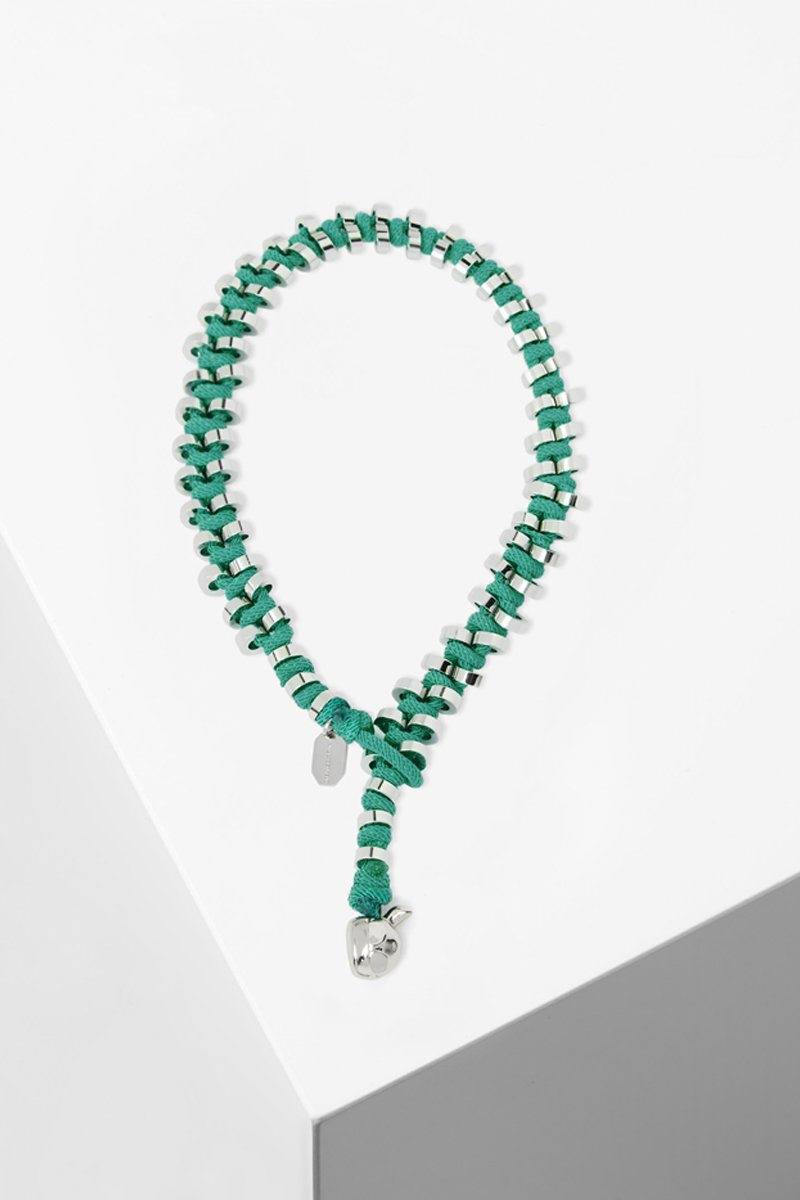 Collier tissé avec anneaux et empiècement avec logo métalliques.