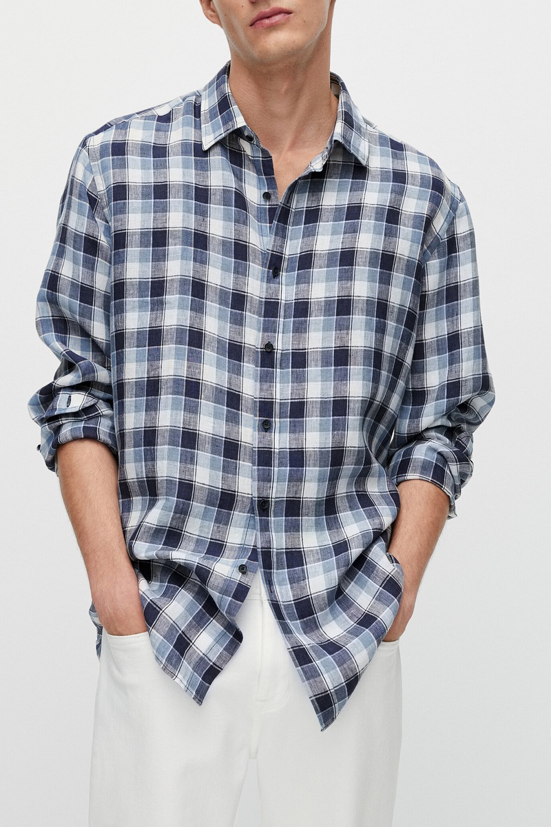 Chemise carreaux 100% lin droite - Bleu et blanc