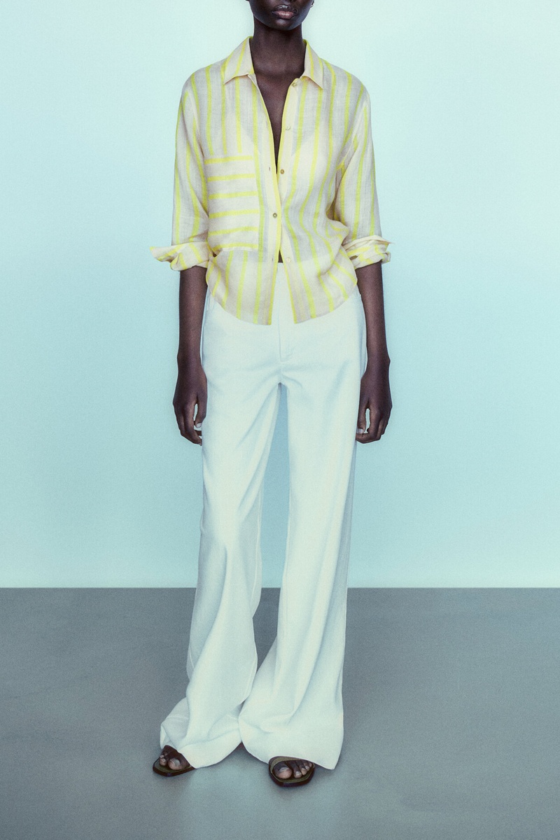 Chemise rayures 100% ramie - Beige et vert citron