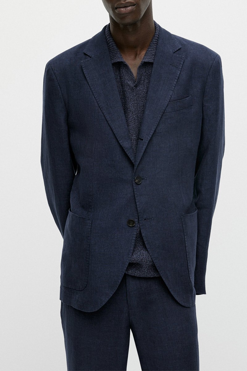Veste de costume motif pied-de-poule en lin - Bleu marine chiné