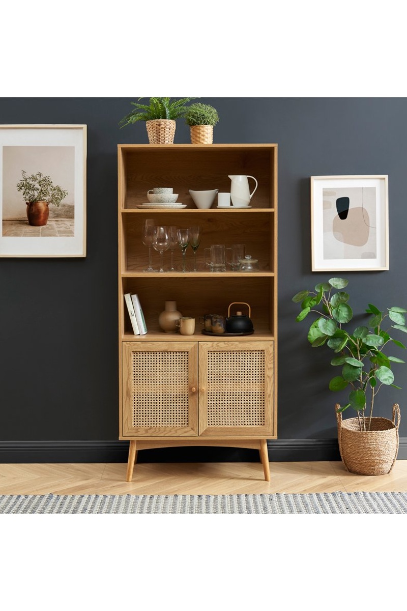 2 portes habillées de cannage en rotin circulaire et 2 étagères.