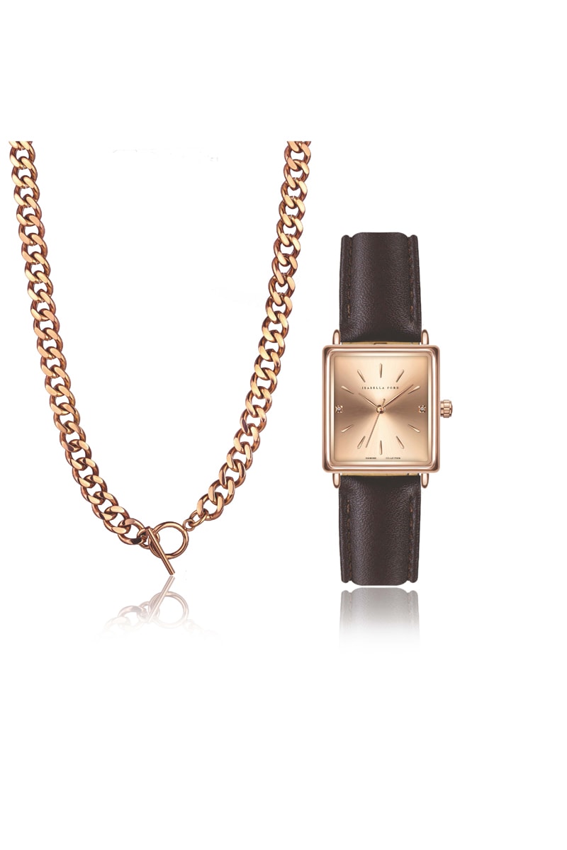 Coffret montre à quartz en cuir, plaqué ion or rose et diamants et collier Florence