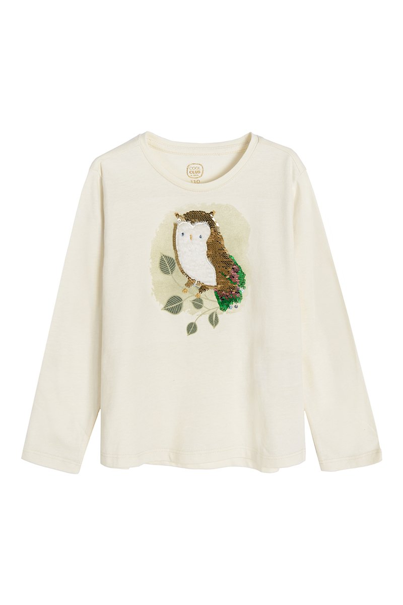 Motifs feuillage, hibou, sequins et empiècement toucher doux devant.