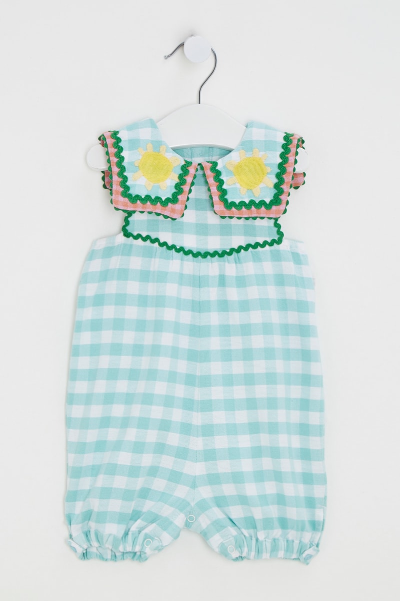 Fermeture pressionnée à l'entrejambe et boutonnée au dos.