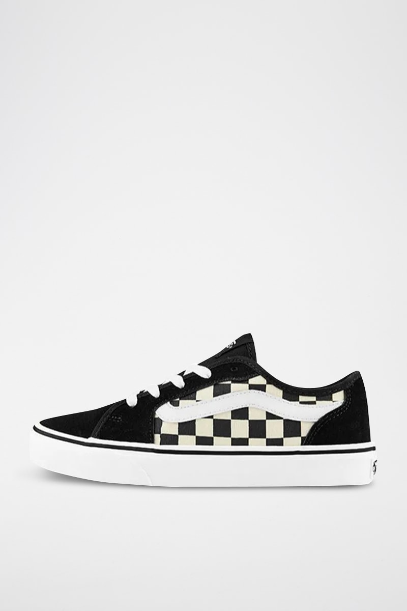 Empiècement contrastant et motifs damiers sur les côtés.