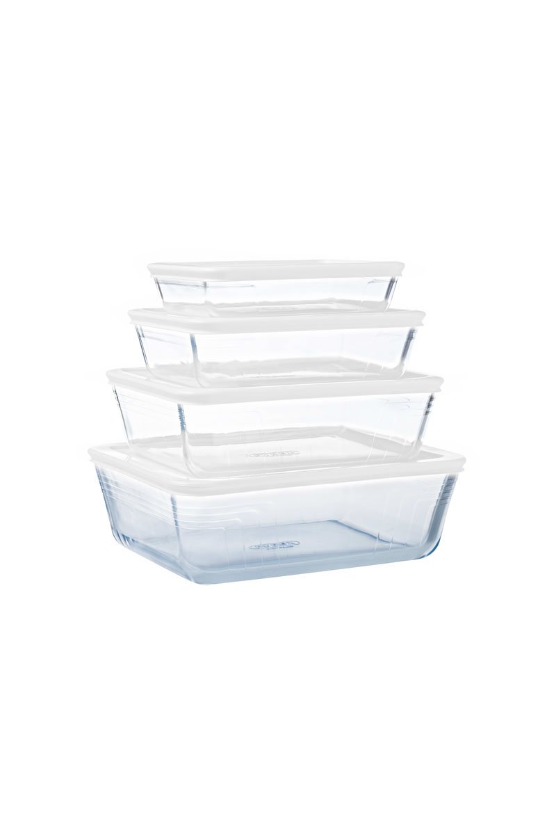 4 plats de conservation rectangulaires en verre borosilicate comprenant :