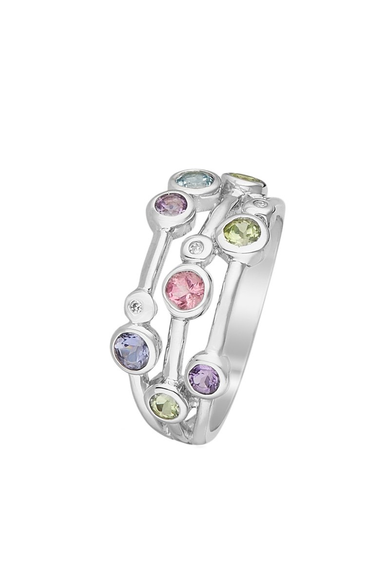 Bague en or blanc sertie de 3 diamants, 2 améthystes, 3 iolites et 3 tourmalines.