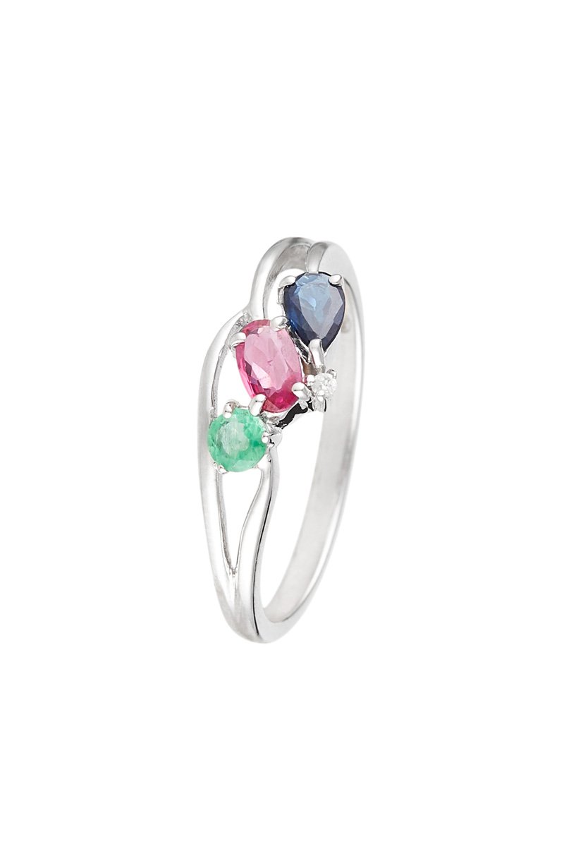 Bague en or blanc sertie d'un diamant, d'une émeraude, d'un rubis et d'un saphir.