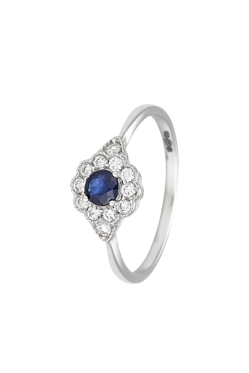 Matière : or blanc 375 / 1000, diamants 0,2 carat/12 et saphir 0,3 carat/1