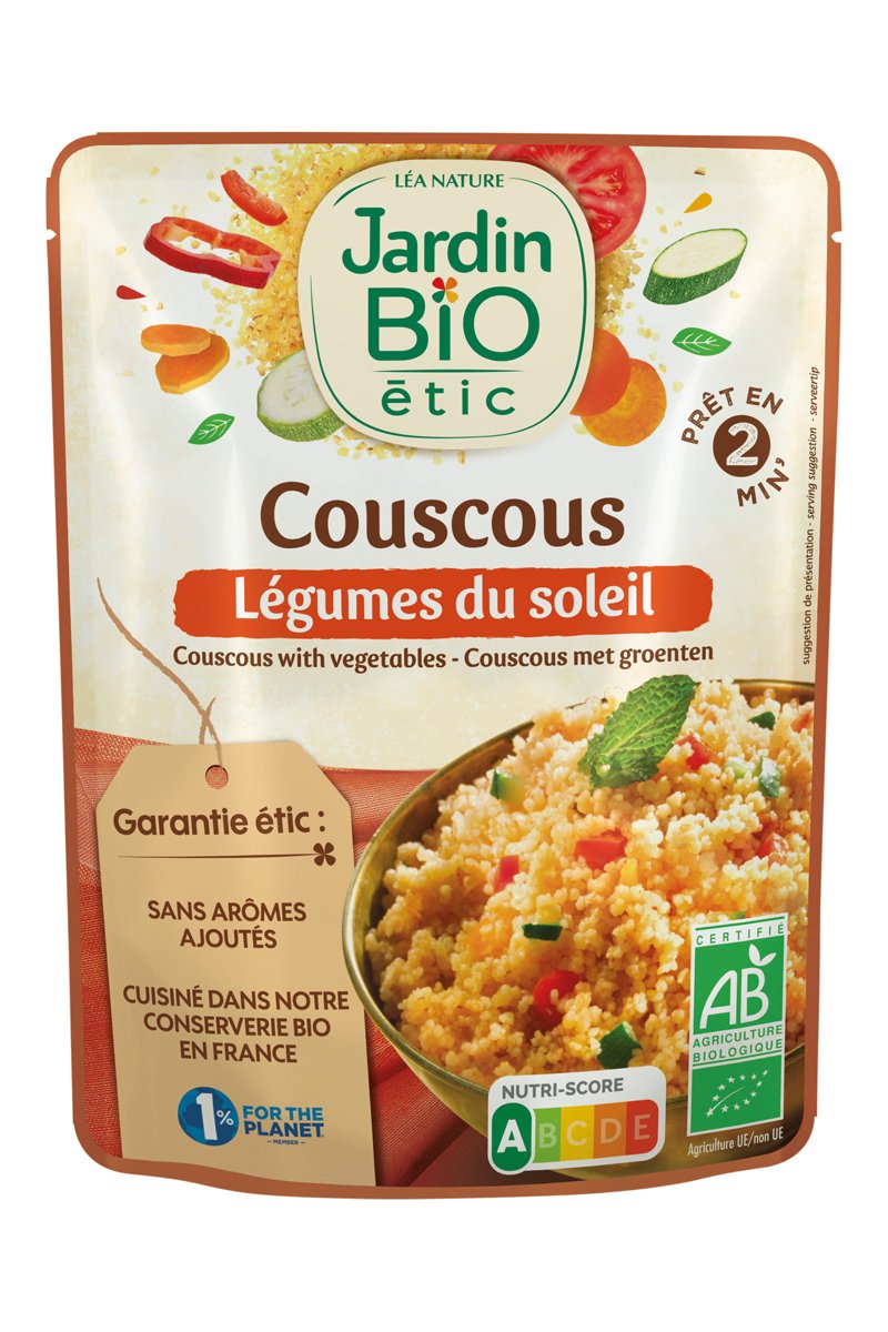 Ingrédients : eau, semoule semi-complète de blé dur* 30%, morceaux de légumes* 25,5% (courgettes*, carottes*, poivrons rouges*), double concentré de tomates*, huile d'olive* vierge extra, huile de tournesol*, sel marin, sucre brut de canne*, épices*, purée d'ail*.