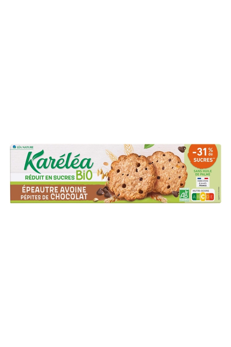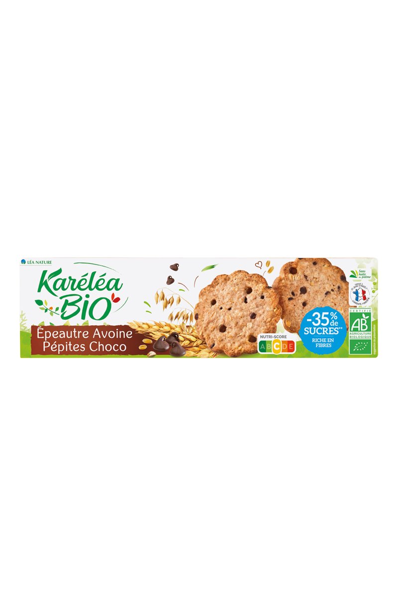 Venez découvrir les saveurs de l'épeautre et des flocons d'avoine associés aux pépites de chocolat dans ces délicieux biscuits Karéléa Bio sans arômes ajoutés.