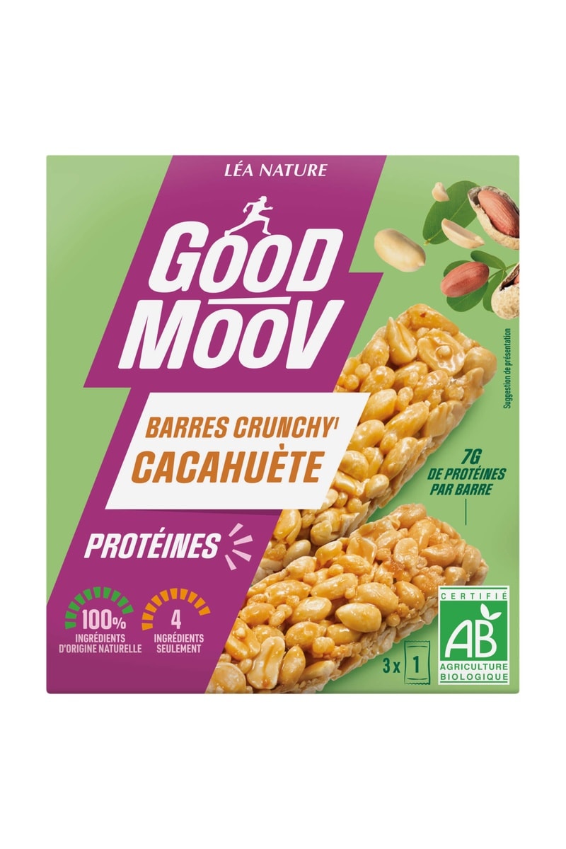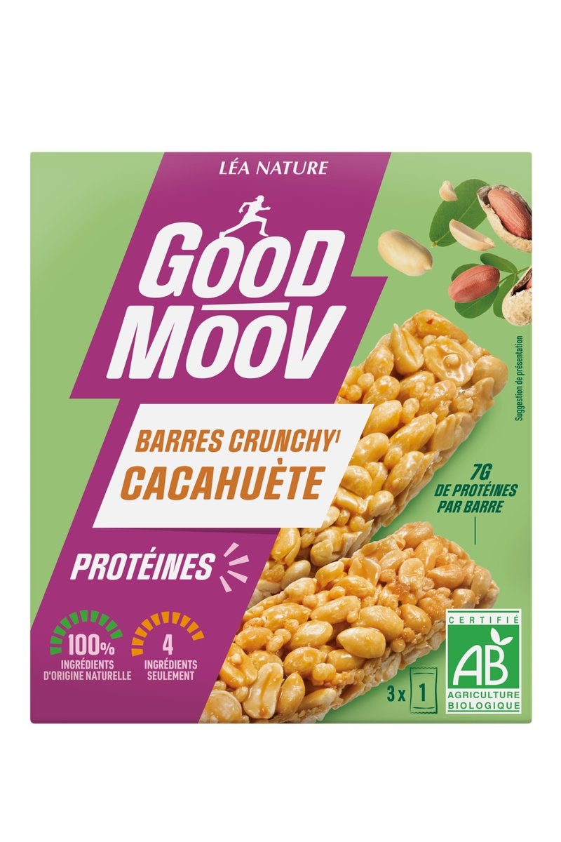 Composée de savoureuses cacahuètes toastées et de beurre de cacahuète, la Barre Crunchy Cacahuète GOOD MOOV est naturellement source de protéines.
