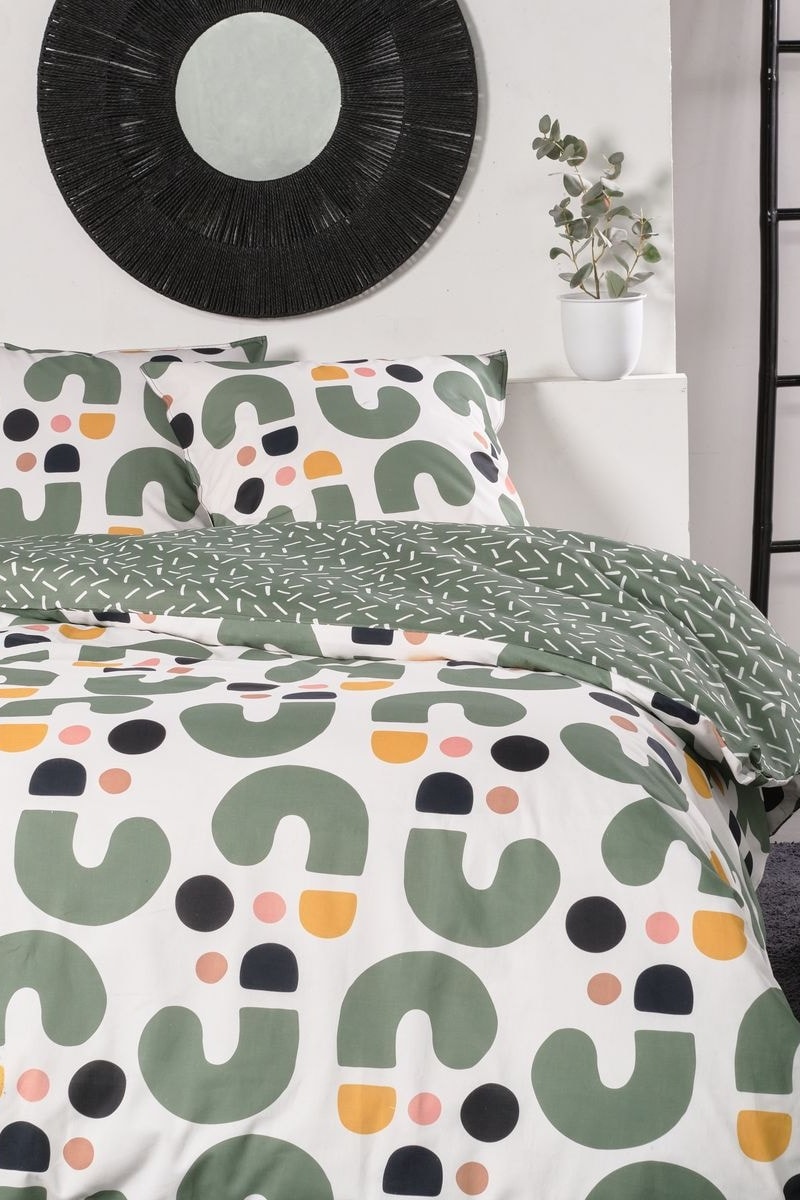 Parure de couette réversible en coton - 57 fils/cm² - blanc et kaki
