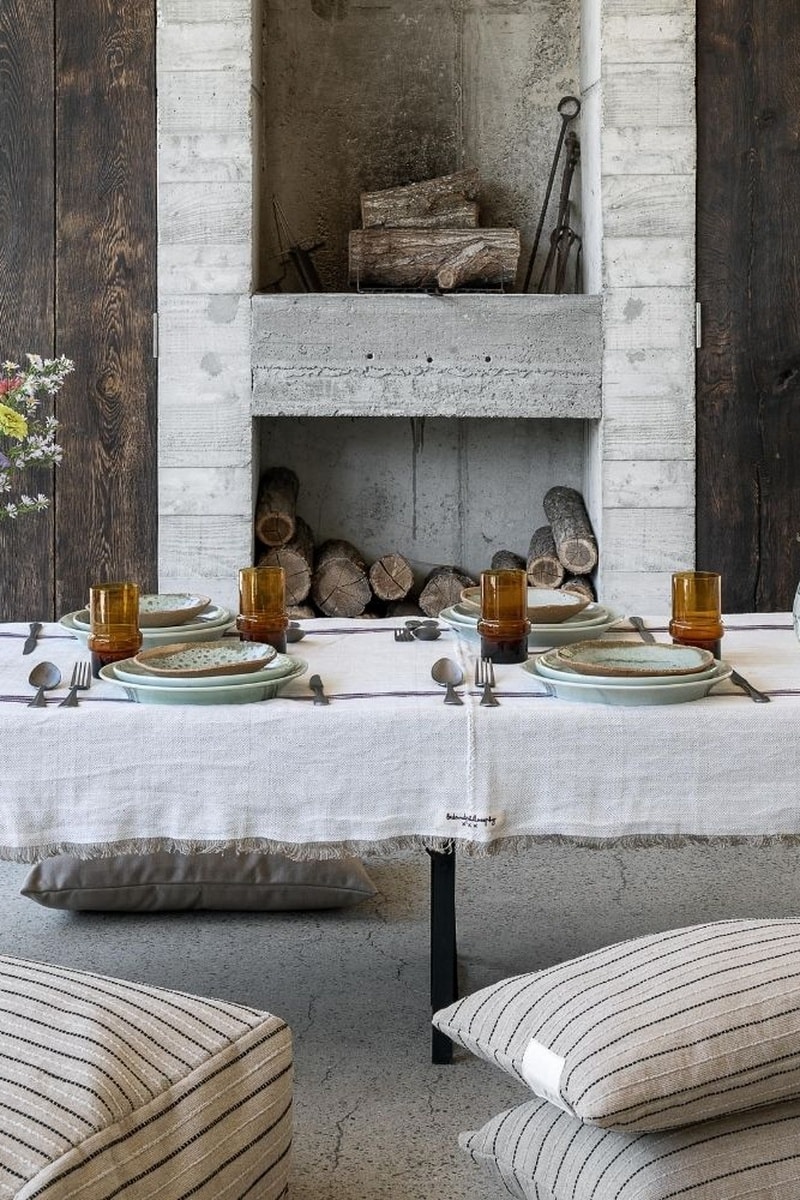 La nappe CHARLOT confectionnée en 50% lin et 50% coton, offre une texture agréable et une résistance idéale pour des repas conviviaux. Son tissage en chevron apporte un subtil relief, tandis que trois rayures violettes traversent la nappe avec élégance, créant un contraste discret mais élégant. Les bords finement frangés ajoutent une touche artisanale et délicate, soulignant le caractère authentique de cette pièce. Parfaite pour sublimer vos repas et apporter une note de style à votre table.