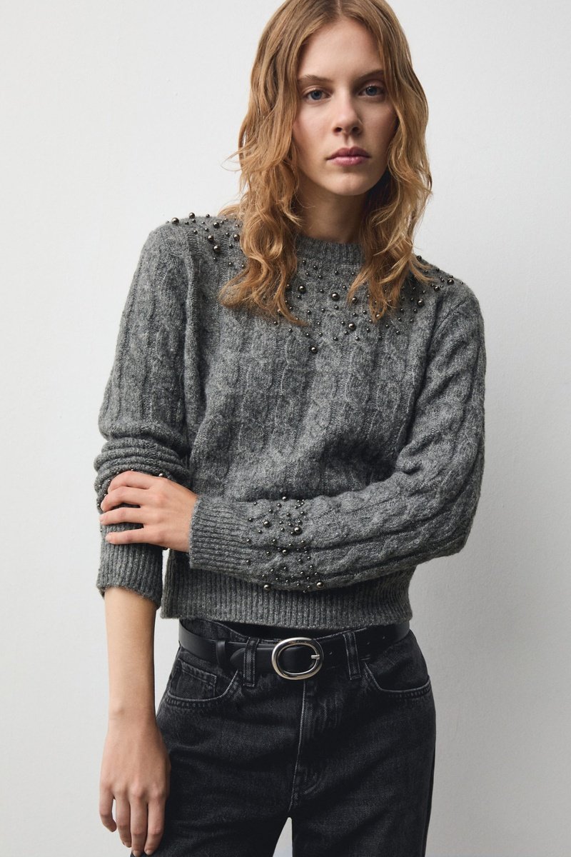 Pull-over torsades détail perles - Gris