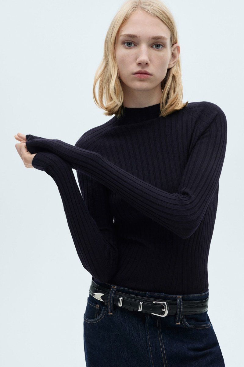 Pull-over côtelé col montant - Bleu marine