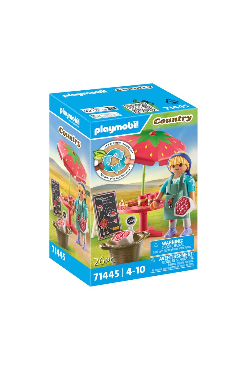 26 accessoires inclus tels que : figurine vendeuse avec tablier, parasol, table de marché, panier, barquettes de fraises, tableau ardoise avec menu, pots de confiture de fraise, caisse.