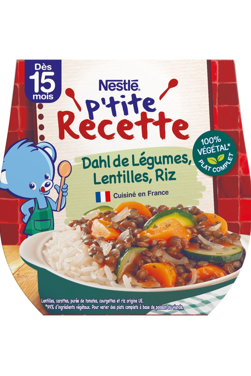 Ingrédients : Eau de cuisson, lentilles cuites 18%, carottes 14%, purée de tomate à base de concentré 10%, courgettes 9%, riz cuit 9%, oignons 6%, huile de colza, amidon, persil, sel, ail, cumin, antioxydant vitamine C, curcuma.