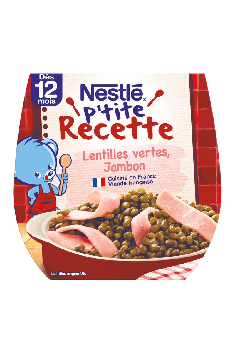 Ingrédients : Purée de tomates à base de concentré 19,2%, lentilles cuites 18%, carottes 17,5%, eau de cuisson, pommes de terre, viande de jambon de porc 8,5% (origine France), oignons, poireaux, huile de colza, amidon, sel, ail, antioxydant acide ascorbique, thym. Peut contenir du gluten.