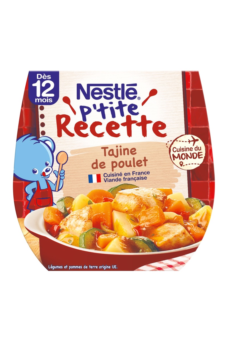 Ingrédients : Eau de cuisson, purée de tomates à base de concentré 16%, carottes 15%, pommes de terre 14%, viande de poulet 8% (origine France), courgettes 8%, oignons, amidon, huile de colza, persil, sel, ail, cumin.