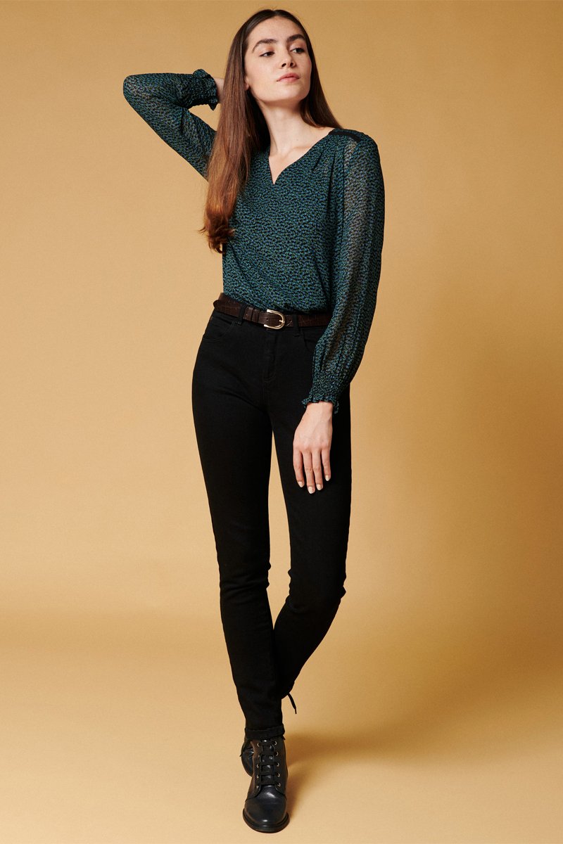Top à manches longues bouffantes avec smocks volants.