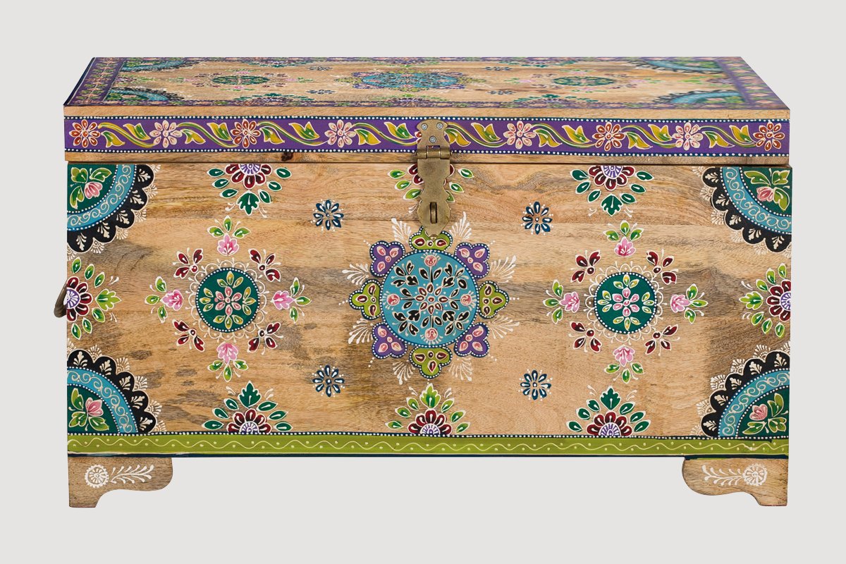 Le coffre est orné de détails multicolores peints à la main, soigneusement réalisés pour ajouter une touche artistique vibrante.