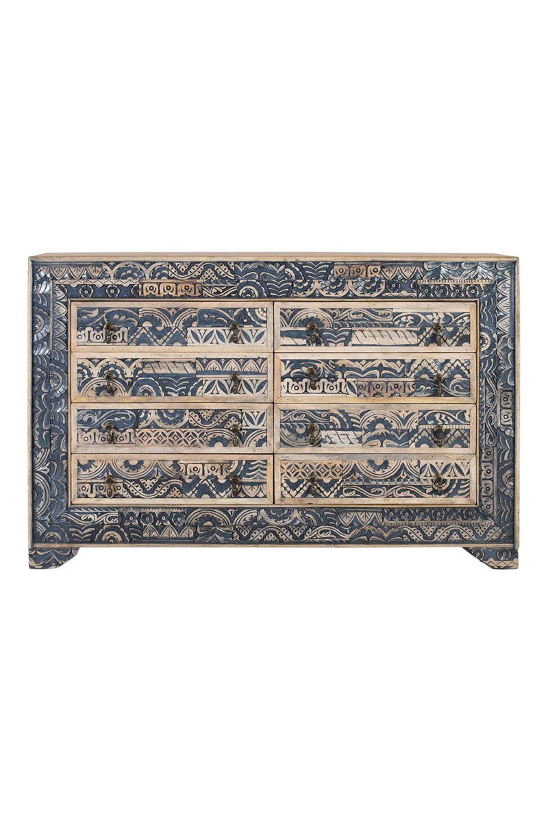 8 tiroirs avec décorations sculptées artisanales.