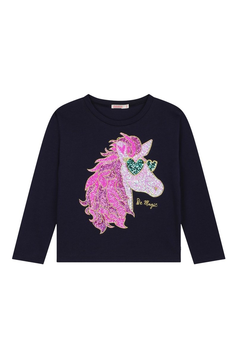 Lettrage et motif tête de cheval à sequins devant.