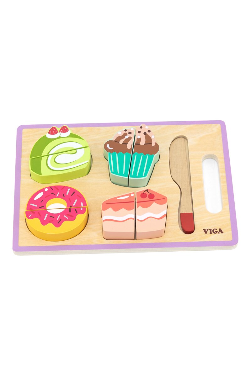 Ce coffret comprend 4 délicieux desserts à découper en 8 parts à l'aide du couteau en bois, ainsi qu'un plateau rabattable servant de planche à découper.