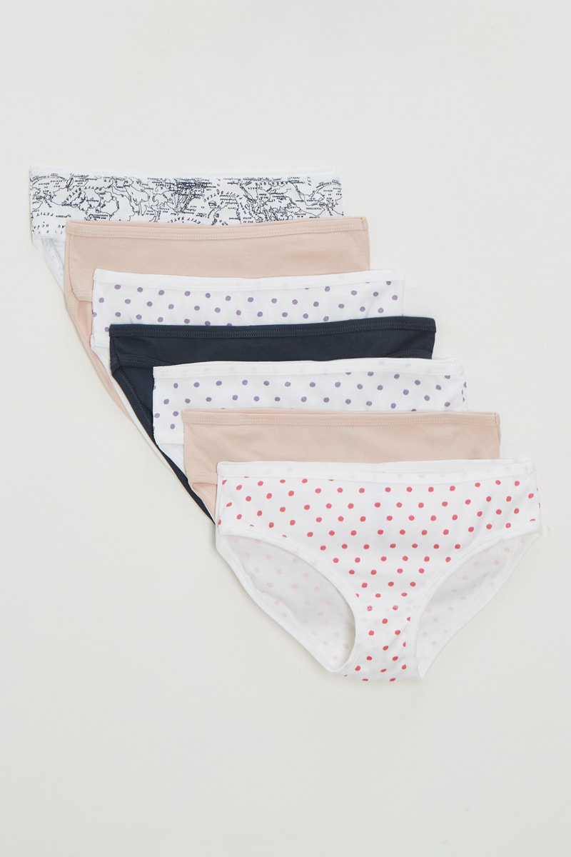 7 culottes dont 3 à motifs à pois, 1 à motifs fantaisie et avec lettrage.