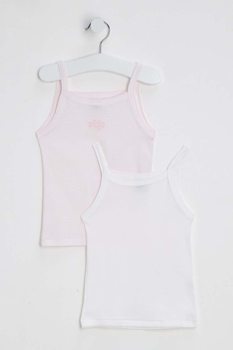 2 débardeurs dont 1 à motifs à rayures, lettrage et logo devant.