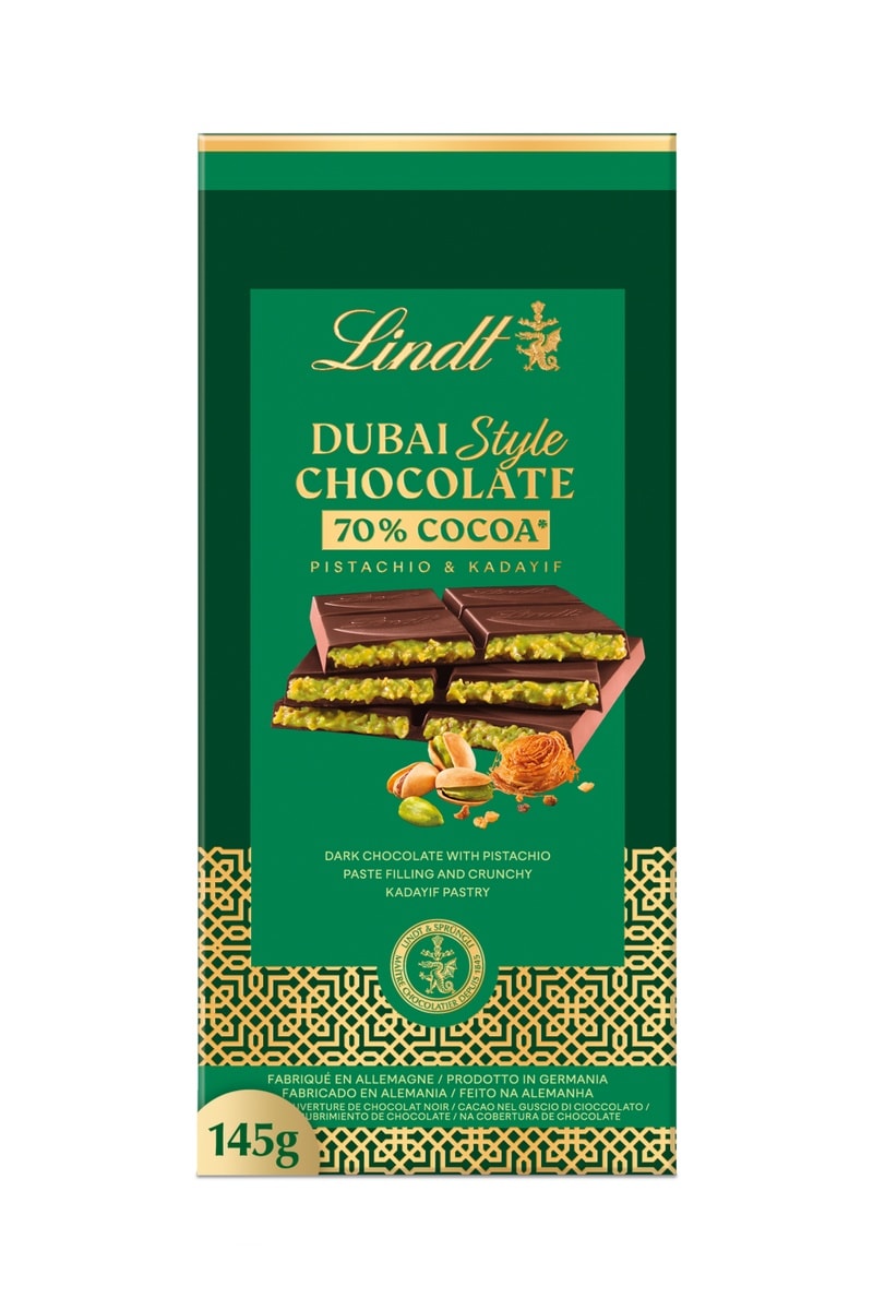 Découvrez la tablette Dubaï Style, une harmonie parfaite et gourmande entre le chocolat au lait fondant Lindt et une garniture pistache kadaïf.
