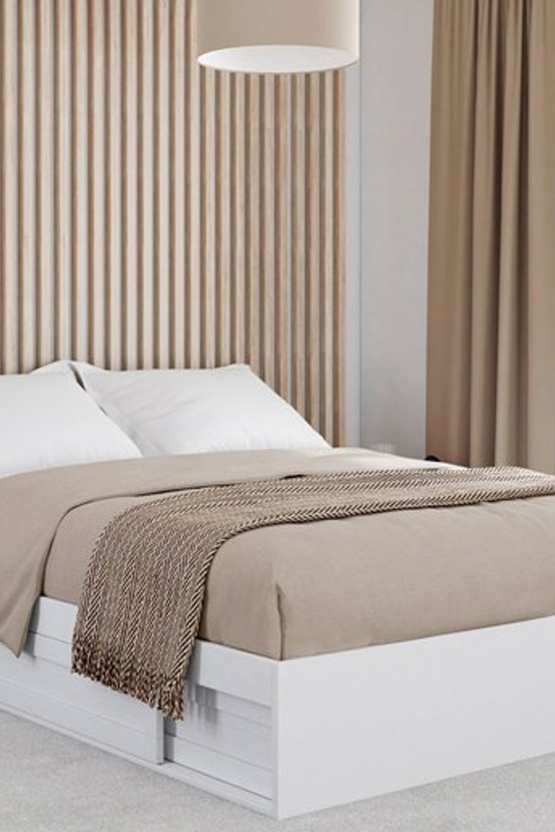 Cadre de lit avec sommier et rangements intégrés.