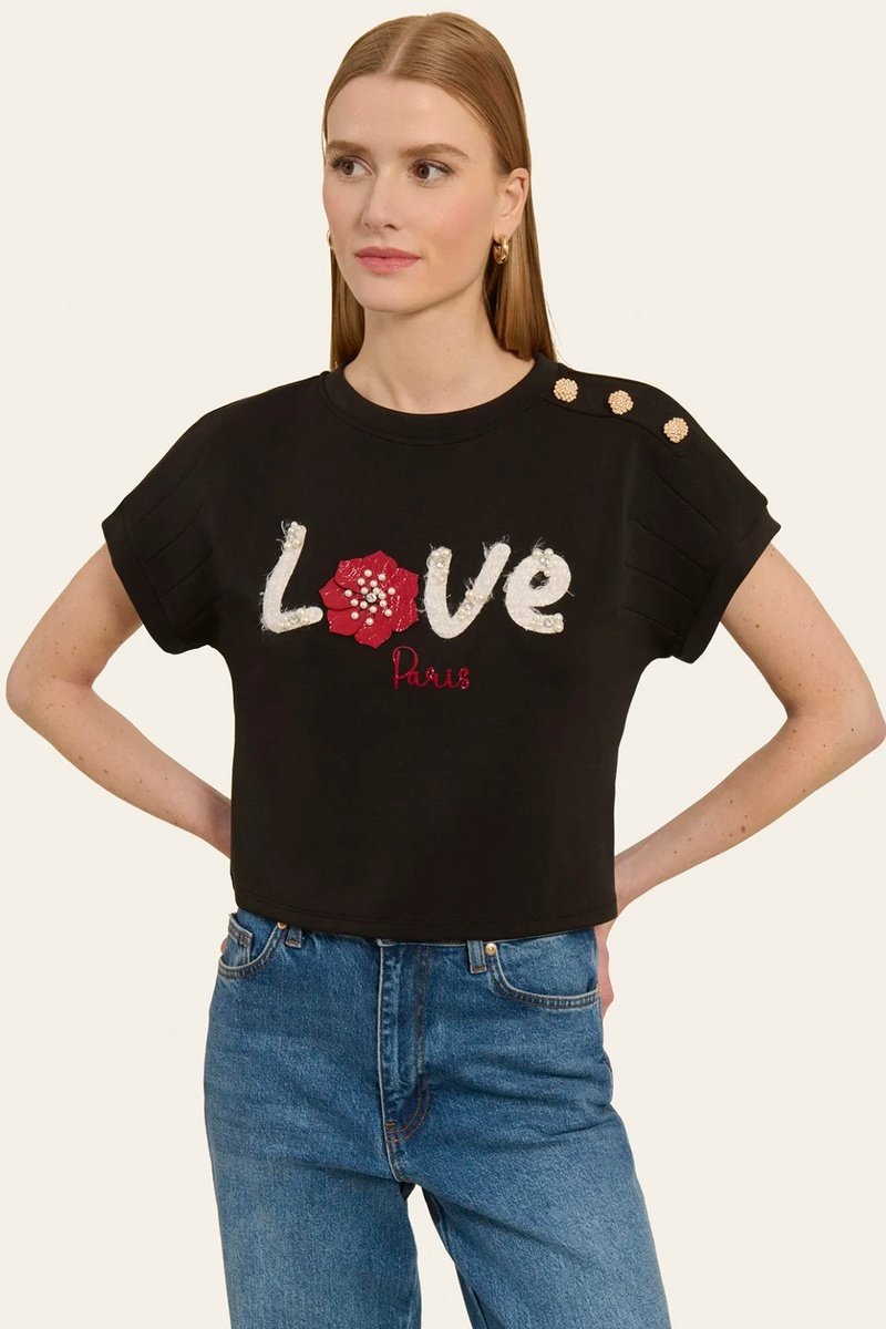 Lettrage, motifs fleurs pailletés et perles décoratives devant.
