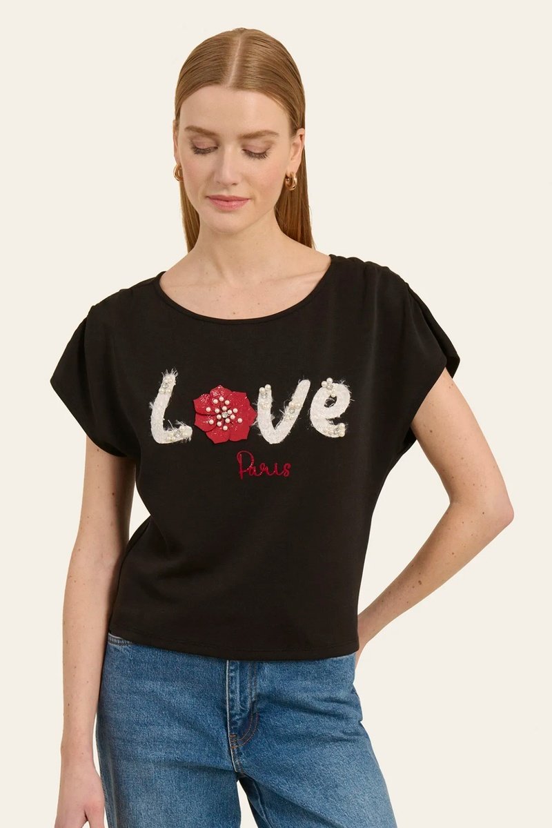 Lettrage, motifs fleurs pailletés et perles décoratives devant.