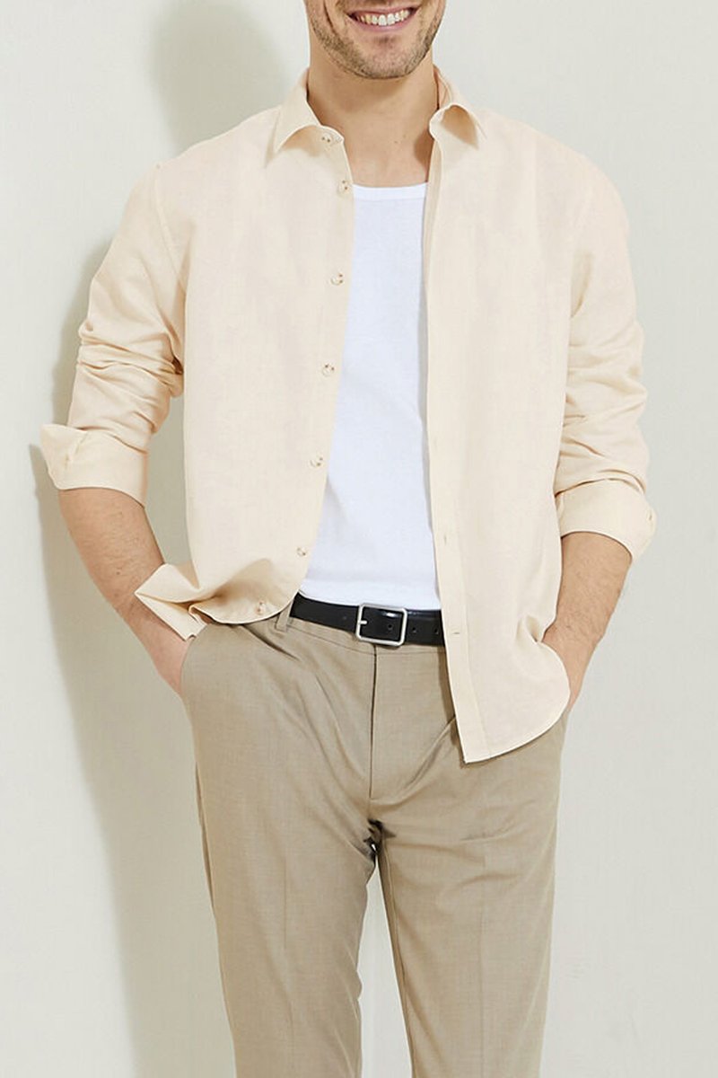 Cette chemise unie en coton et lin est une pièce moderne et casual, facile à porter en toutes circonstances.