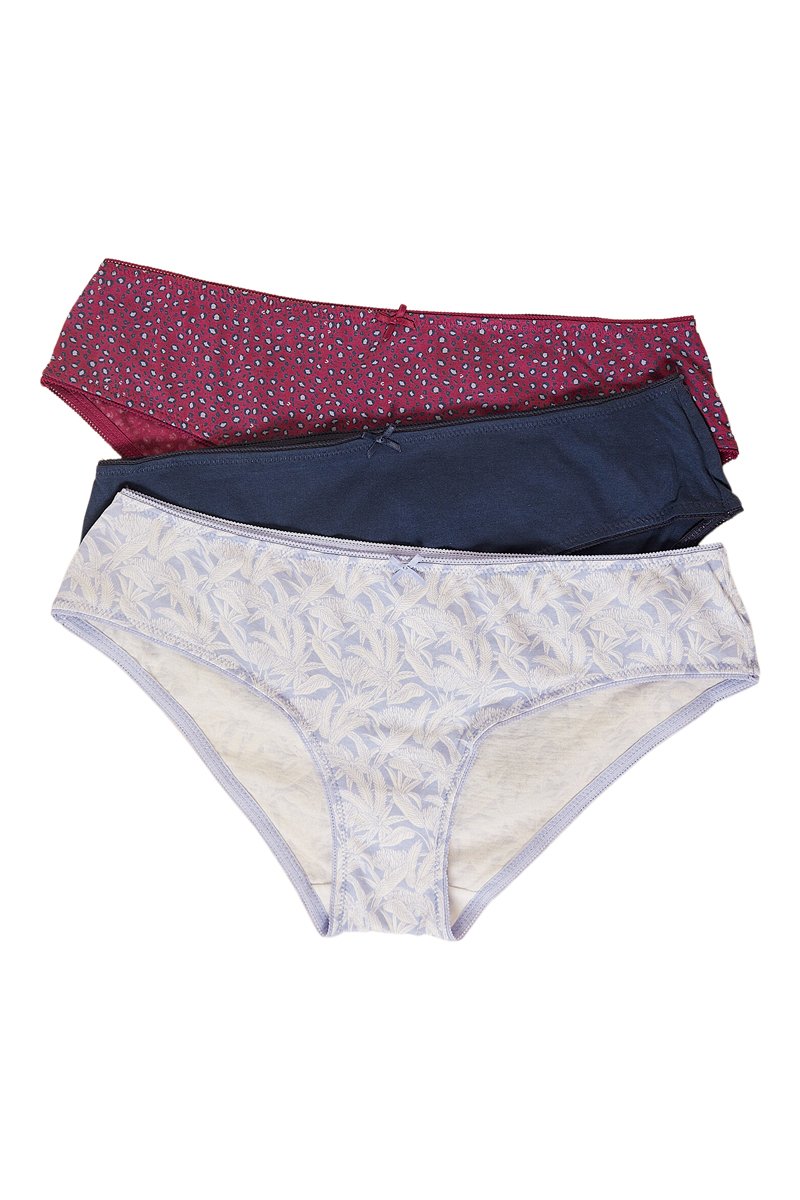 3 culottes dont 1 à motifs feuilles et 1 à motifs fantaisie.