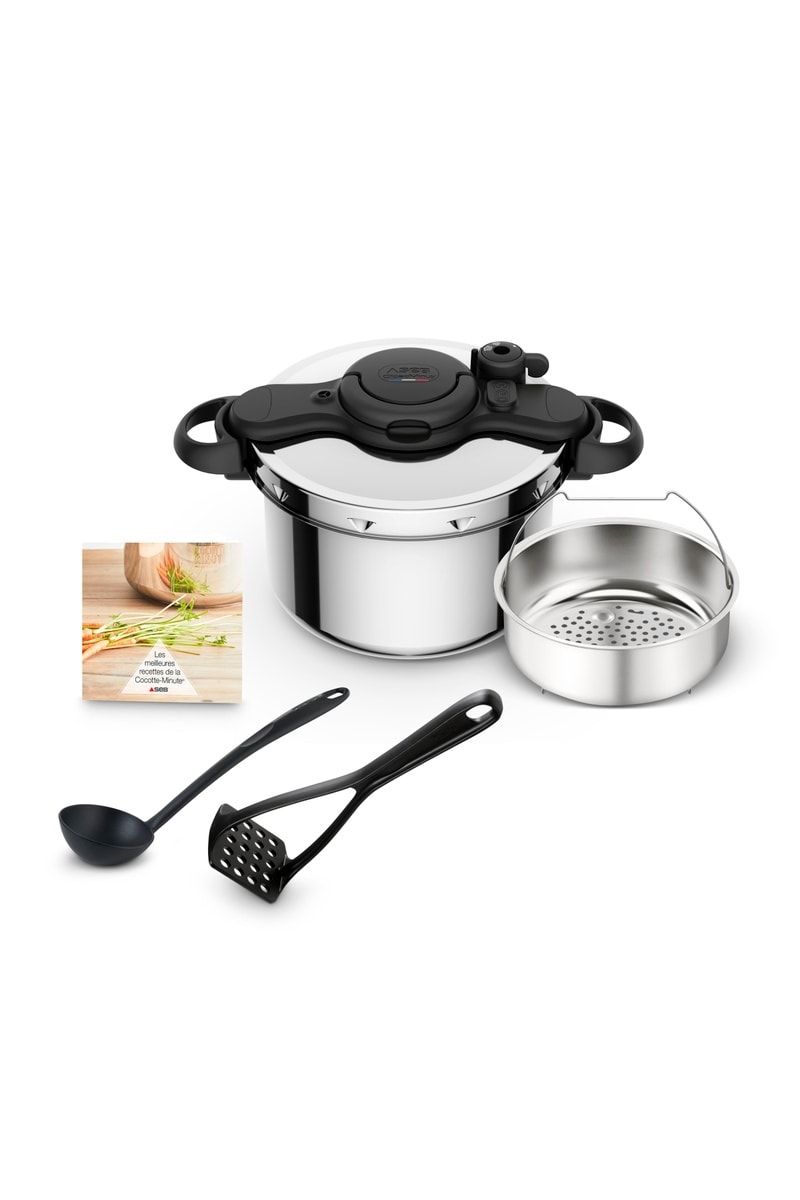 Livre avec recettes, louche, presse-purée et panier vapeur inclus.