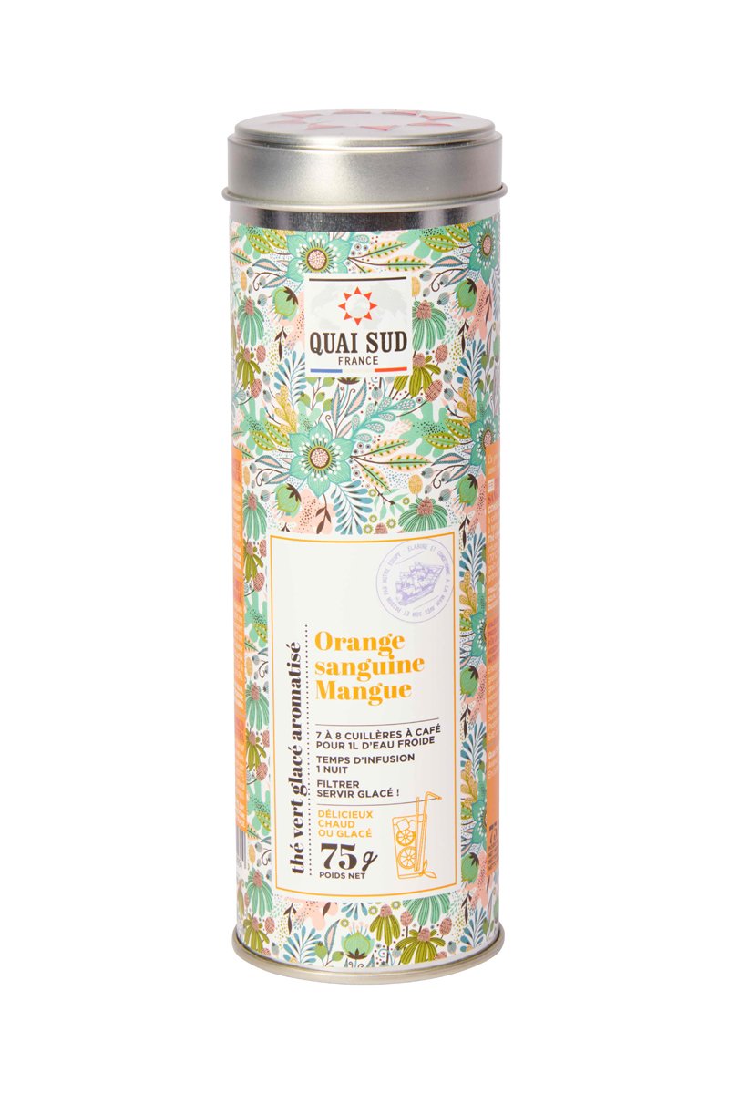 Ingrédients : thé vert de Chine, arôme naturel goût orange sanguine 4,5%, zestes d'orange 3,6%, arôme (mangue) 0,9%.