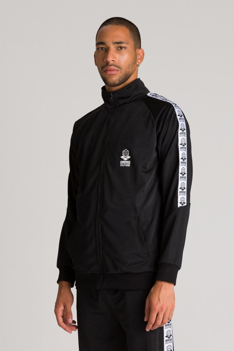Bandes contrastantes avec lettrage et logo aux épaules et sur les manches.