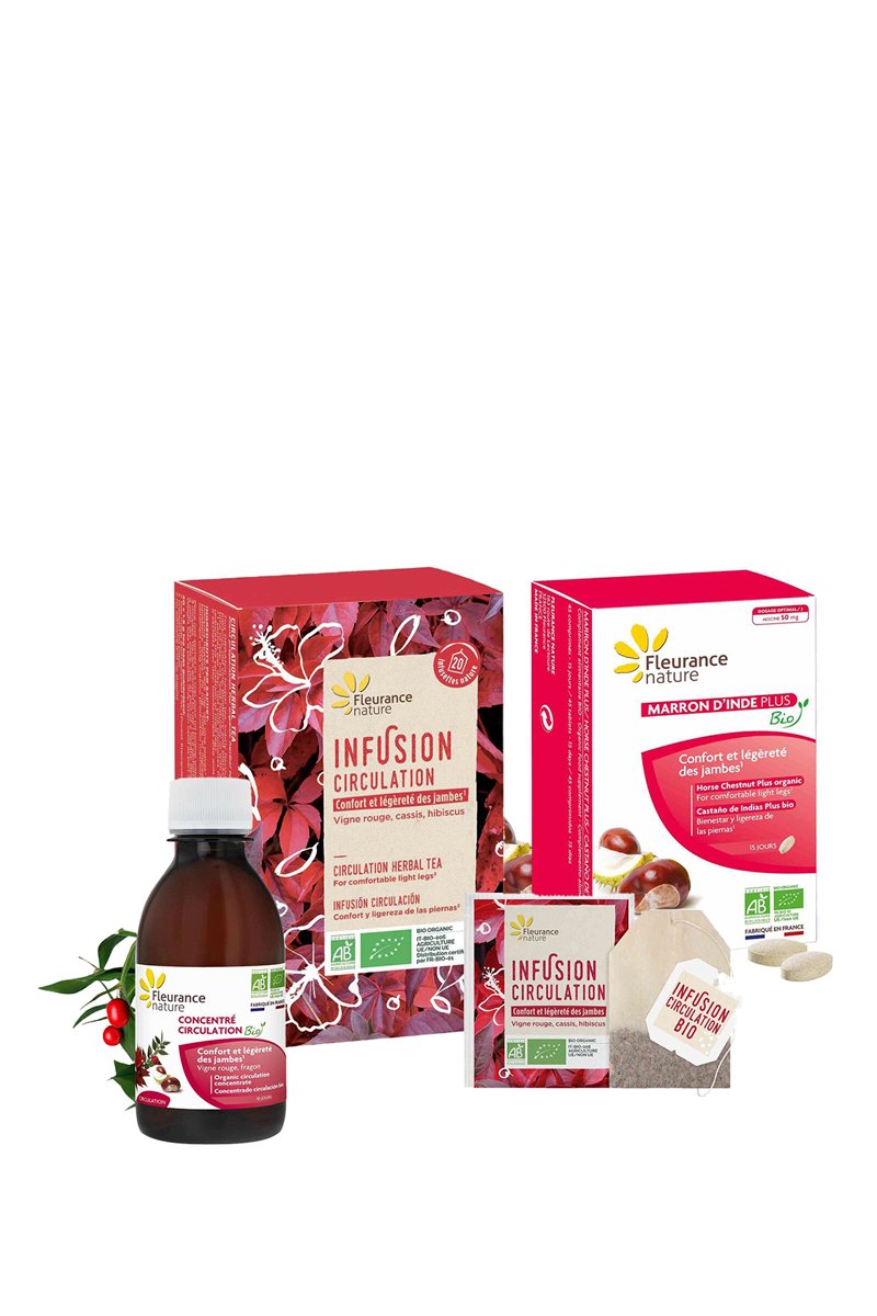 Ingrédients pour 1 sachet INFUSION CIRCULATION: Fleurs d’hibiscus* 825 mg, feuilles de vigne rouge* 375 mg, baies de cassis* 150 mg, feuilles de myrtille* 75 mg, arôme fruits rouges*. *100% des ingrédients d'origine agricole sont obtenus selon le mode de production biologique. Ce produit n'a pas été testé sur les animaux, conformément à la règlementation européenne. Ce produit convient aux personnes ayant un régime alimentaire végétalien (vegan).