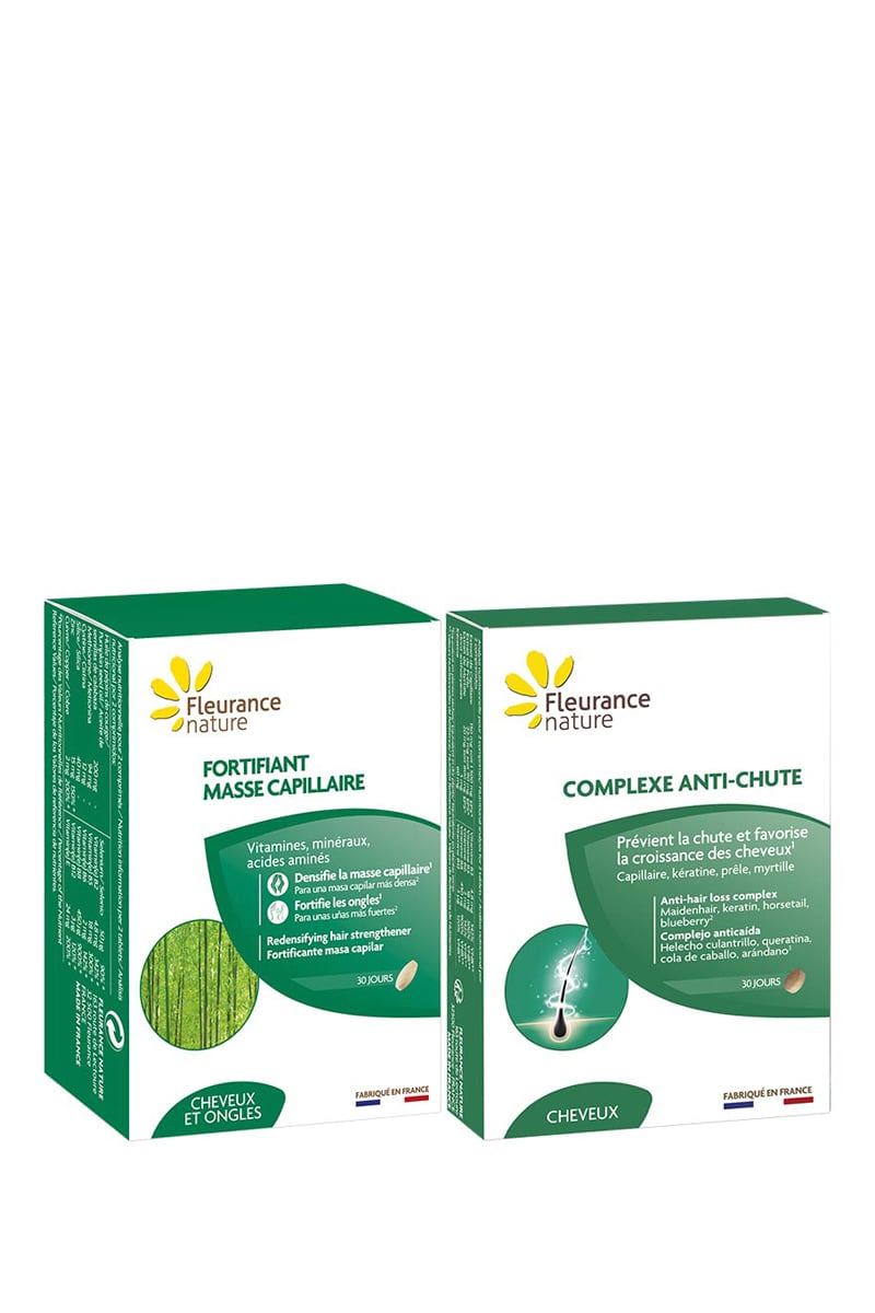 Complexe anti-chute pour 2 comprimés : Oxyde de magnésium, anti-agglomérant : carbonate de magnésium, agent de charge : gomme d’acacia, extrait de capillaire (Adiantum capillus veneris)(origine non UE) 150 mg soit 1500 mg EPS*, méthionine, vitamines (B2, B5, B6, B8, B12), kératine 60 mg, citrate de zinc, huile de tournesol, levure riche en sélénium, extrait de prêle (Equisetum arvense)(origine non UE) 22,5 mg soit 90 mg EPS*, extrait de baies de myrtille (Vaccinium myrtillus)(origine UE/non UE) 20 mg soit 800 mg EPS*, cystine. *EPS : Équivalents Plantes Sèches. *Équivalent Plantes Sèches.
