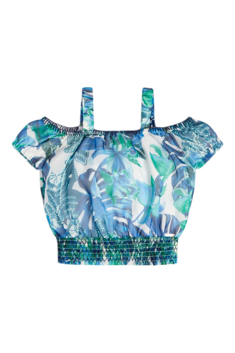 Blouse à manches courtes élastiques avec découpe.