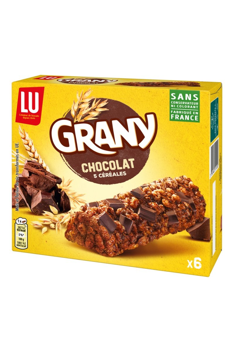Ingrédients : Sirop de glucose, farine (riz 8,8 %, blé 5,3 %, blé malté 0,6 %), chocolat 13 % [sucre, pâte de cacao, beurre de cacao, émulsifiant (lécithines de soja), arôme], stabilisant (sorbitols), maïs 12 %, pâte de cacao, flocons d'avoine 6 %, huile de colza, huile de palme, flocons de seigle malté 2,5 %, sucre, sel, gluten de blé, dextrose, émulsifiant (lécithines), extrait de malt d'orge, arôme (contient noisette).
