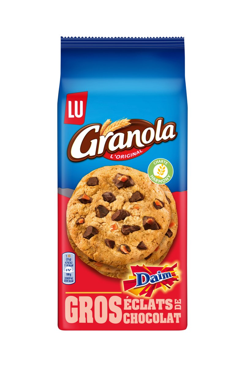Ingrédients : farine de BLÉ 35 %, sucre, huile de palme, chocolat 17 % (sucre, pâte de cacao, graisses végétales (palme, karité en proportions variables), dextrose, beurre de cacao, émulsifiant (lécithines de soja)), beurre de cacao, poudres à lever (carbonates d'ammonium, diphosphates, carbonates de sodium), sirop de glucose, sel, arômes, pâte de cacao, LAIT écrémé en poudre, LAIT entier en poudre, amandes 0,3%, lactosérum en poudre (de LAIT), beurre pâtissier, perméat de lactosérum (de LAIT), flocons d'AVOINE, LAIT écrémé concentré sucré, colorant (bêta-carotène), beurre, émulsifiants (lécithines de soja, lécithines de tournesol), agents d'enrobage (gomme arabique, shellac). PEUT CONTENIR ŒUF, AUTRES FRUITS À COQUE.