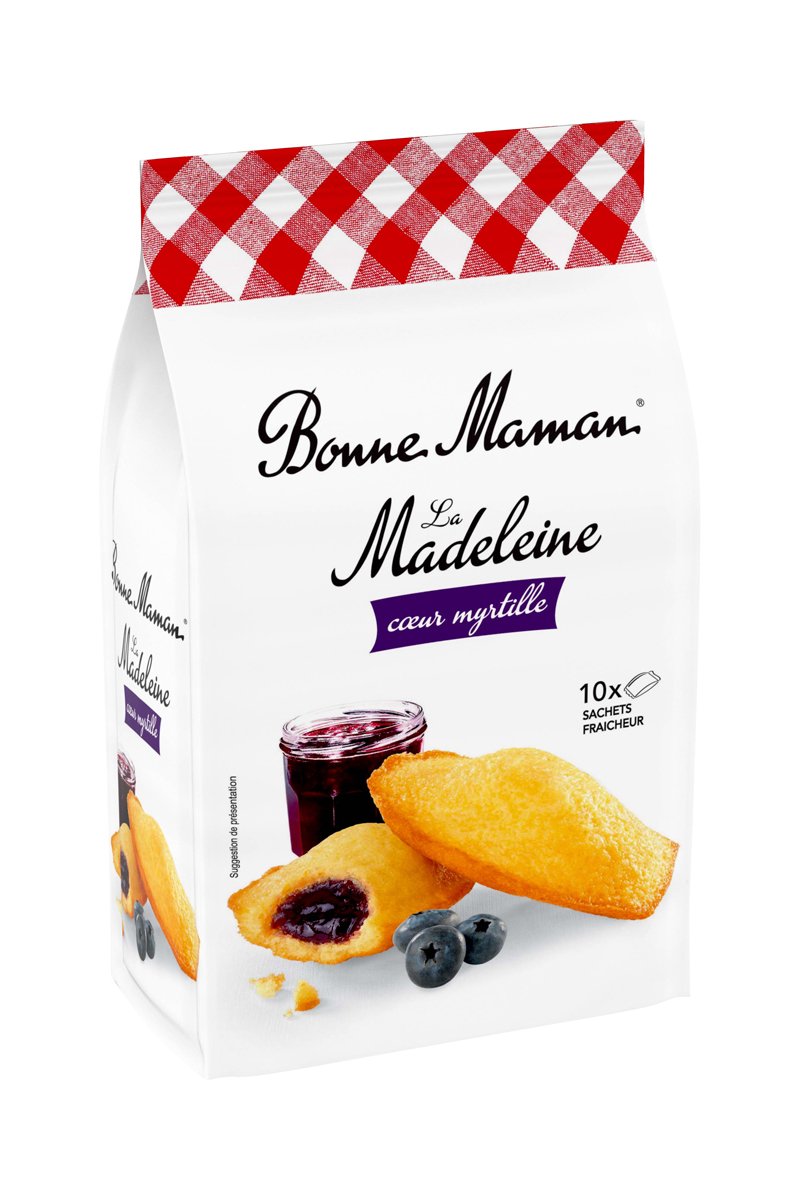 Bonne Maman met tout son amour dans la préparation de sa recette traditionnelle de madeleine au généreux coeur de myrtille. De tendres madeleines pur beurre associées à un coeur fruité à la myrtille. Sans colorant et fabriquées en France. Pour préserver toute sa saveur et son moelleux, chaque madeleine Bonne Maman est emballée avec soin dans son petit sachet fraicheur.