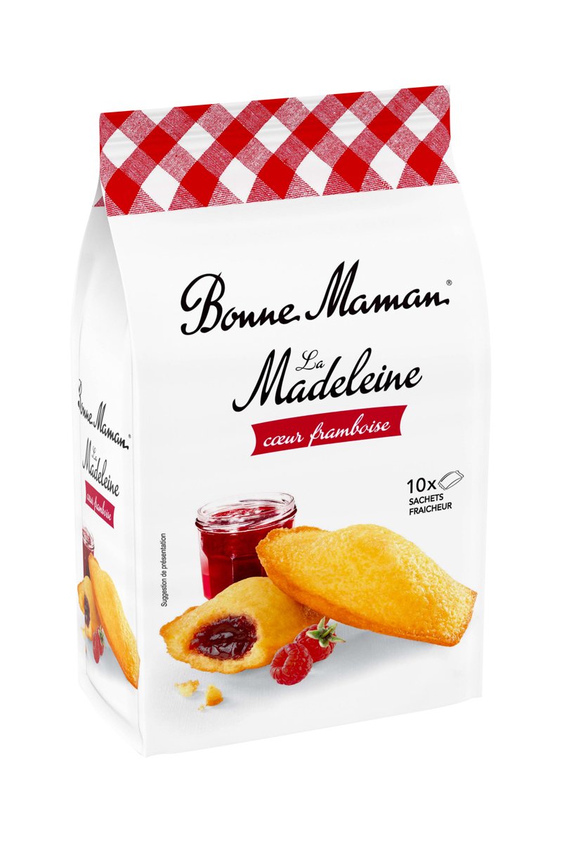 Bonne Maman met tout son amour dans la préparation de sa recette traditionnelle de madeleine au généreux coeur de framboise. De tendres madeleines associées à un coeur acidulée à la framboise pour un bon goût fruité. Sans colorant et fabriquées en France. Pour préserver toute sa saveur et son moelleux, chaque madeleine Bonne Maman est emballée avec soin dans son petit sachet fraicheur.
