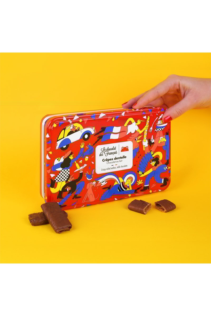 Ce coffret en métal renferme 18 crêpes dentelle enrobées d'un chocolat au lait très gourmand.