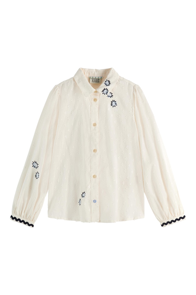 Motifs fleurs brodés à l'encolure, sur la manche droite et devant.